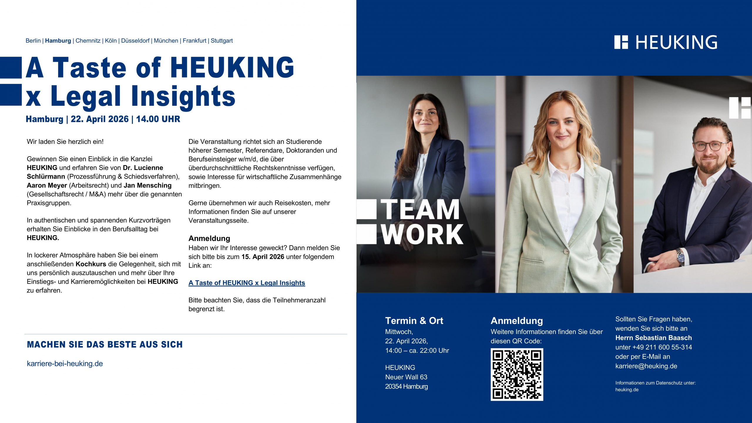 A Taste of HEUKING x Legal Insightsvon refvredaktionin Aktuelles & Veranstaltungenan Veröffentlicht am 11. März 202611. März 2026 Alle Infos findet ihr hier: https://app.guestoo.de/public/event/f02b86e9-511d-402d-b770-effc9d6121a7?lang=de FacebookShare on XLinkedInWhatsAppEmailCopy Link