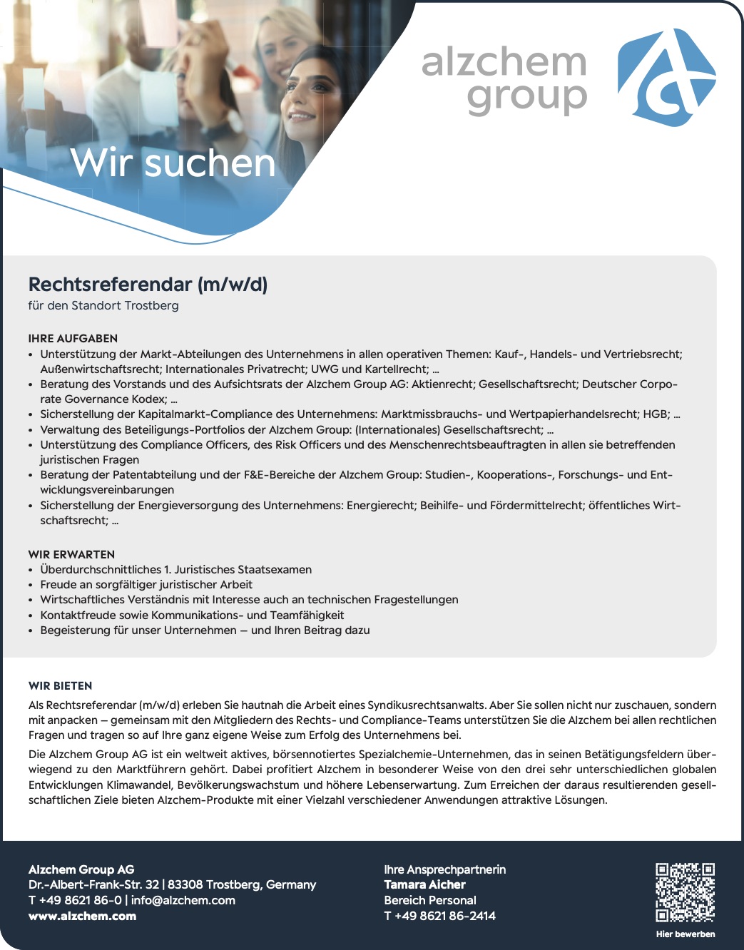 Die alzchem group sucht einen Referendar (m/w/d)von refvredaktionin Stellenanzeigenan Veröffentlicht am 21. Juli 202321. Juli 2023