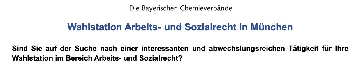 Die Bayerischen Chemieverbände: Wahlstation Arbeits- und Sozialrecht in München!von refvredaktionin Stellenanzeigenan Veröffentlicht am 15. Oktober 202315. Oktober 2023 Den Link zur Homepage findet ihr hier.
