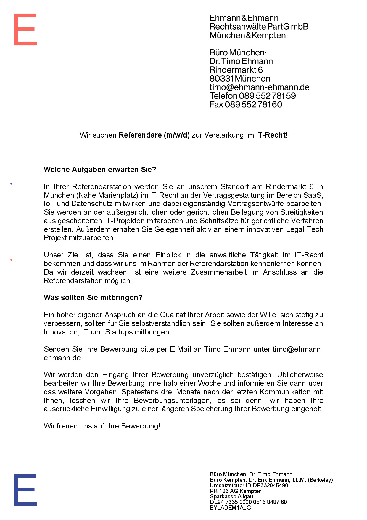 Ehmann&Ehmann sucht Referendare (m/w/d) zur Verstärkung im IT-Recht