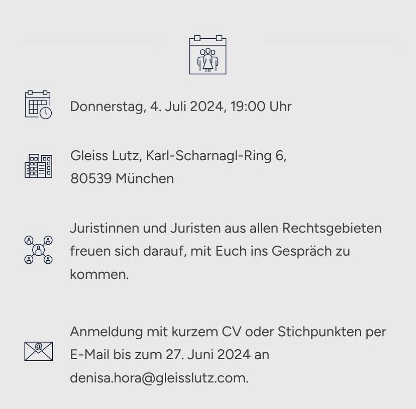 Aperitivo mit herrlichem Blick über die Münchener Altstadt und dabei etwas über die Arbeit und die Einstiegsmöglichkeiten in einer der führenden Wirtschaftskanzleien Deutschlands erfahren? Seid dabei! Alle Interessierten, die bereits das Erste Examen abgeschlossen haben, sind herzlich eingeladen, am 4. Juli 2024 einen Abend mit Gleiss Lutz bei Drinks und Musik über den Dächern Münchens zu verbringen. Weitere Informationen zur Veranstaltung sowie die Möglichkeit zur Anmeldung bis zum 27. Juni findet Ihr hier.