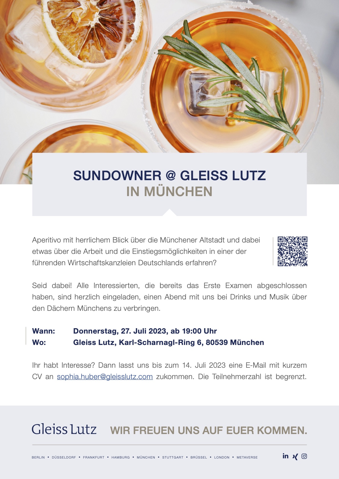 Gleiss Lutz lädt zum gemeinsamen Sundowner am 27. Juli 23 um 19 Uhrvon refvredaktionin Aktuelles & Veranstaltungenan Veröffentlicht am 3. Juli 20233. Juli 2023