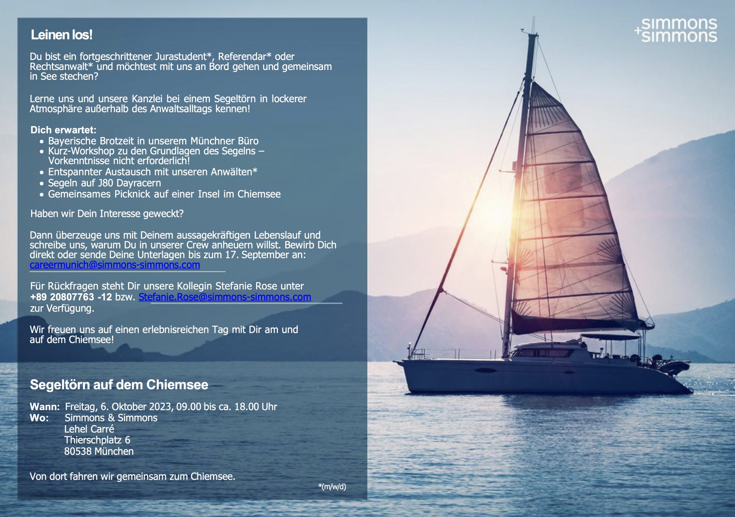 Leinen los! Lerne Simmons&Simmons bei einem Segeltörn in lockerer Atmosphäre kennen.von refvredaktionin Aktuelles & Veranstaltungenan Veröffentlicht am 10. Juli 202310. Juli 2023