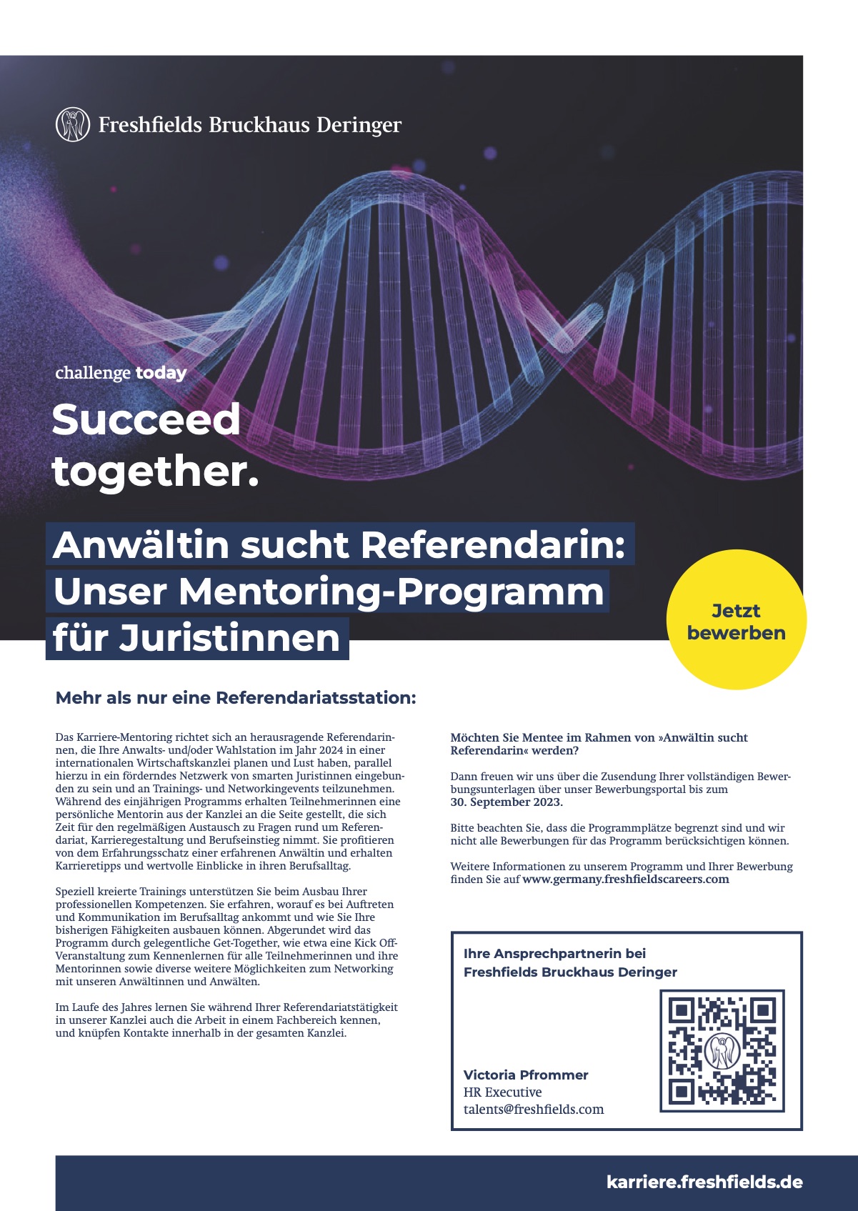 Das Karriere-Mentoringprogramm richtet sich an herausragende Referendarinnen, die Ihre Anwalts- und/oder Wahlstation im Jahr 2024 in einer internationalen Wirtschaftskanzlei planen und Lust haben, parallel hierzu in ein förderndes Netzwerk von smarten Juristinnen eingebunden zu sein. Mehr Infos hier.