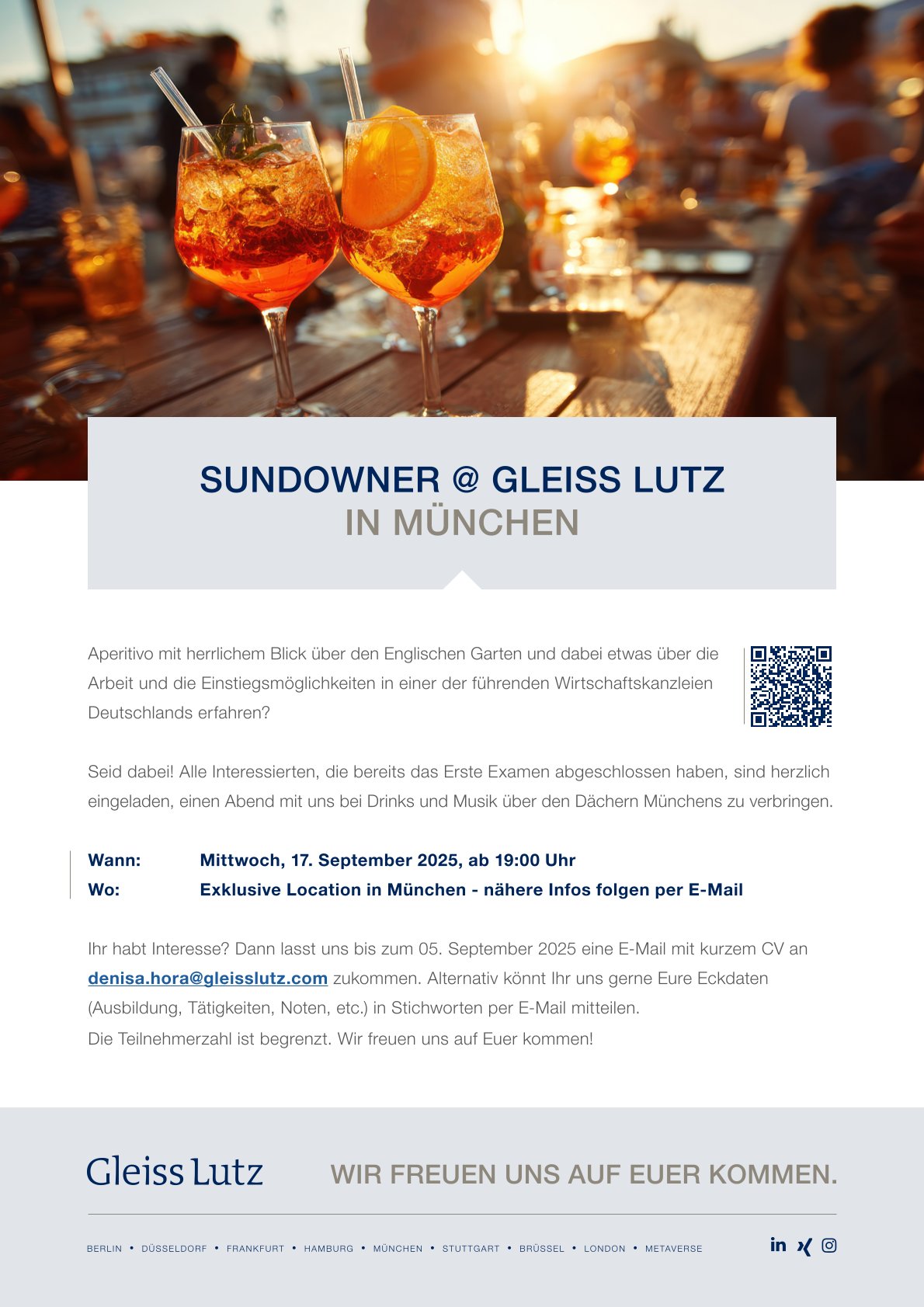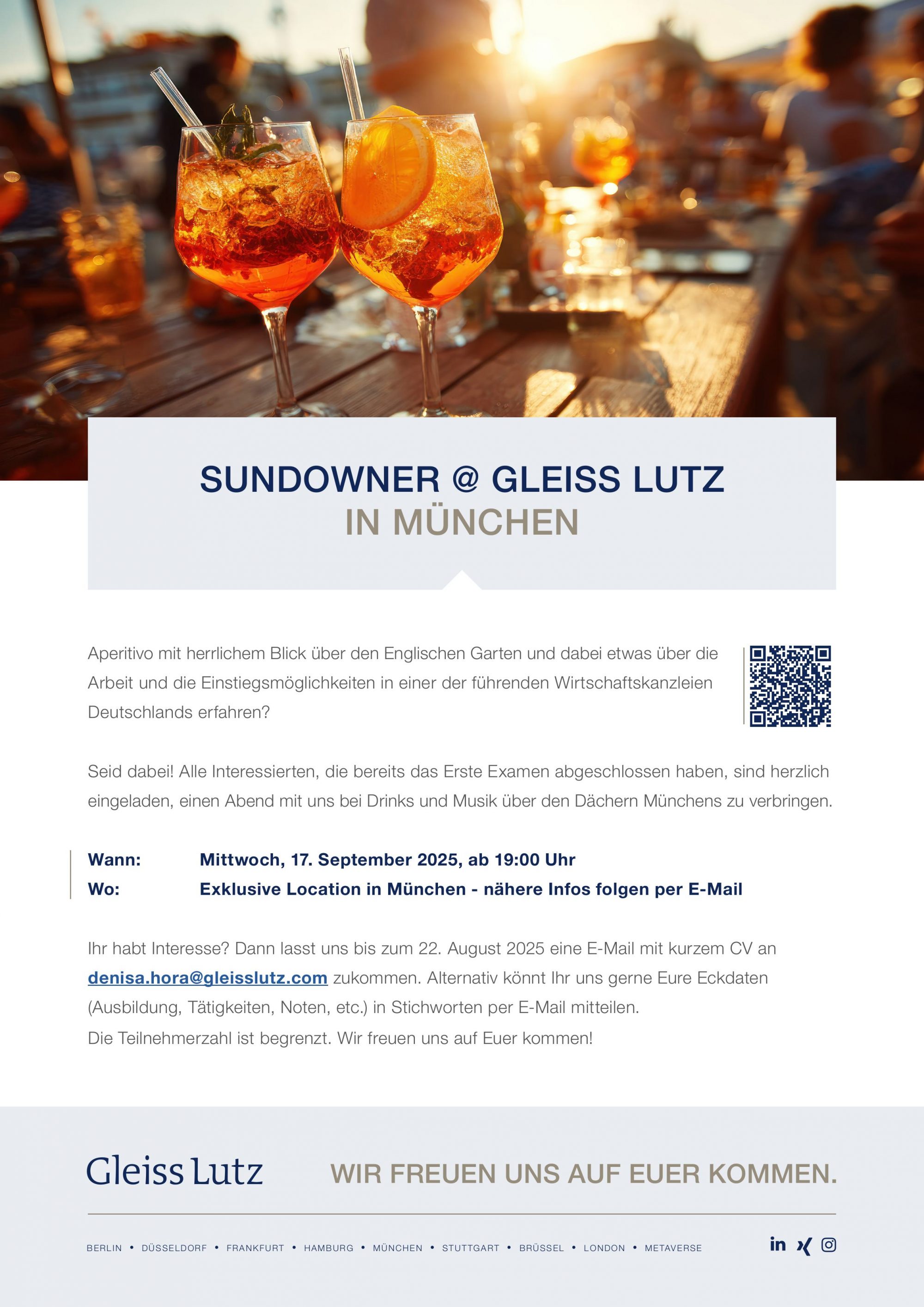 Sundowner @ Gleiss Lutz am 17. September 2025von refvredaktionin Aktuelles & Veranstaltungenan Veröffentlicht am 13. August 202513. August 2025